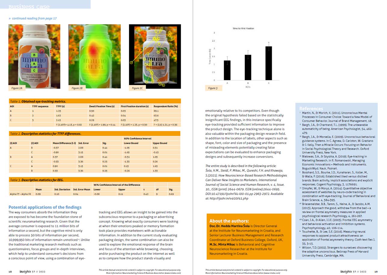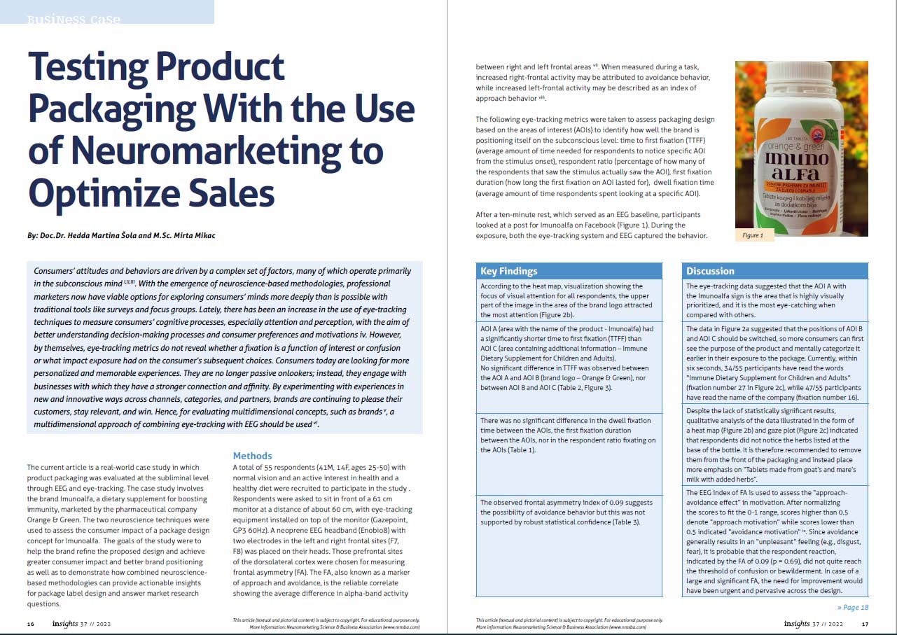 Consumers’ attitudes and behaviors are driven by a complex set of factors, many of which operate primarily in the subconscious mindi,ii,iii. With the emergence of neuroscience-based methodologies, professional marketers now have viable options for exploring consumers’ minds more deeply than is possible with traditional tools like surveys and focus groups. Lately, there has been an increase in the use of eye-tracking techniques to measure consumers’ cognitive processes, especially attention and perception, with the aim of better understanding decision-making processes and consumer preferences and motivationsiv. However, by themselves, eye-tracking metrics do not reveal whether a fixation is a function of interest or confusion or what impact exposure had on the consumer’s subsequent choices. Consumers today are looking for more personalized and memorable experiences. They are no longer passive onlookers; instead, they engage with businesses with which they have a stronger connection and affinity. By experimenting with experiences in new and innovative ways across channels, categories, and partners, brands are continuing to please their customers, stay relevant, and win. Hence, for evaluating multidimensional concepts, such as brandsv, a multidimensional approach of combining eye-tracking with EEG should be usedvi. The current article is a real-world case study in which product packaging was evaluated at the subliminal level through EEG and eye-tracking.The goals of the study were to help the brand refine the proposed design and achieve greater consumer impact and better brand positioning as well as to demonstrate how combined neurosciencebased methodologies can provide actionable insights for package label design and answer market research questions. (Šola, H.M. & Mikac, M. (2022). Testing Product Packaging With The Use of Neuromarketing to Optimize the Sales. Insights 37. Neuromarketing Science and Business Association, Netherlands. pp.16-19.)